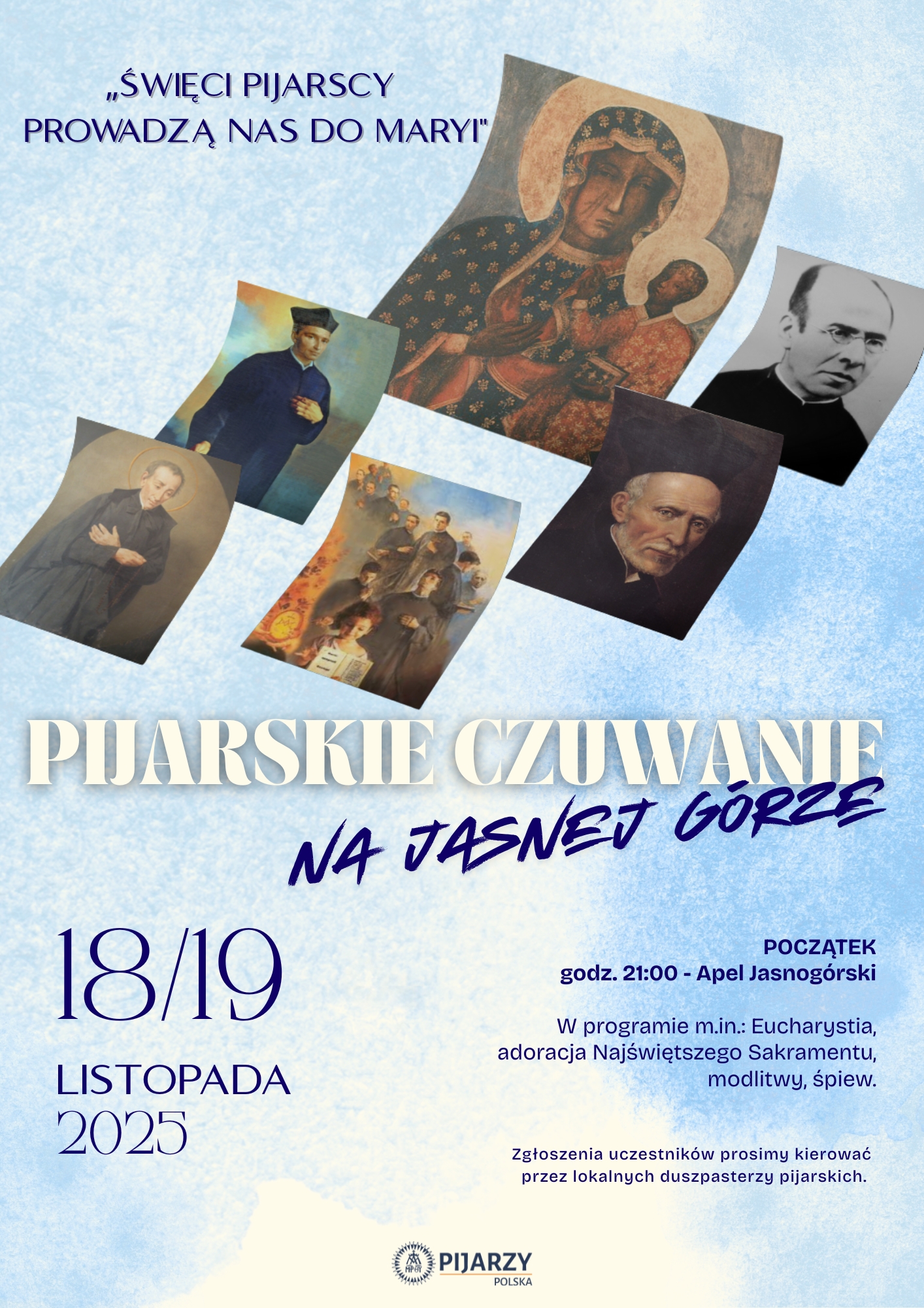 Zapraszamy na Pijarskie Czuwanie na Jasnej Górze, które obędzie się w nocy z dnia 18 na 19 listopada 2025 r. Rozpoczniemy wspólnym apelem jasnogórskim o godz. 21.00, a następnie będziemy trwać na czuwaniu do samego rana. Hasło spotkania to: "Święci Pijarscy prowadzą nas do Maryi".