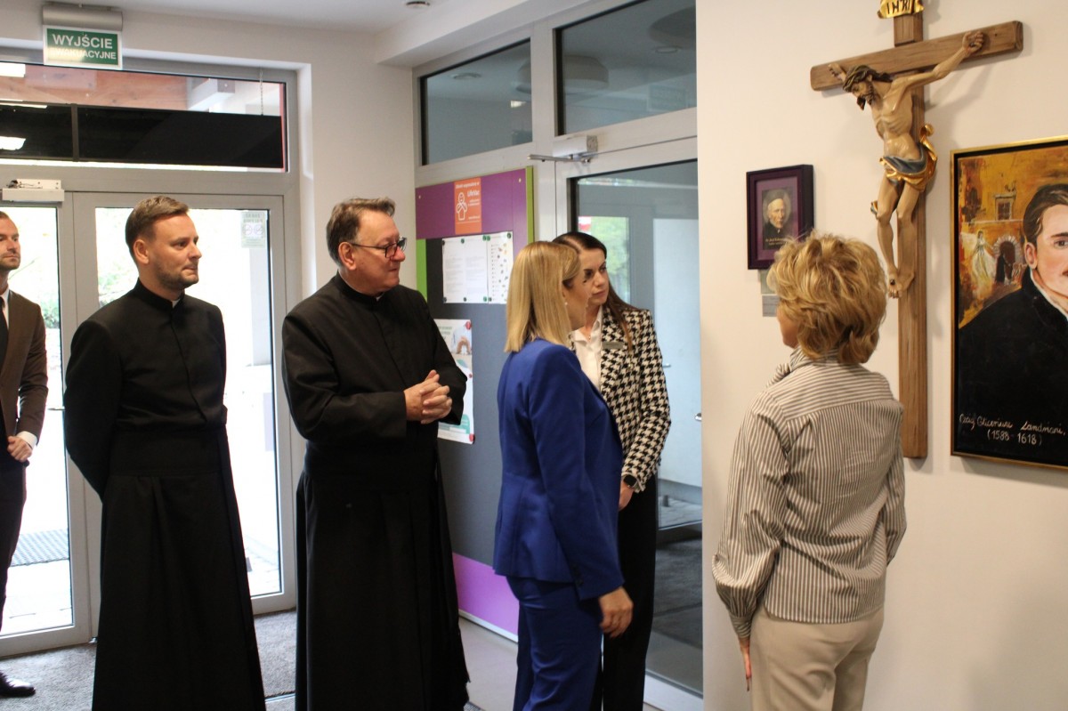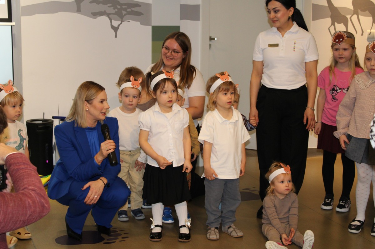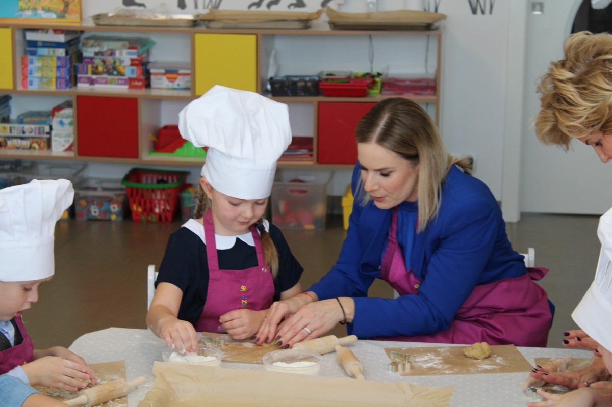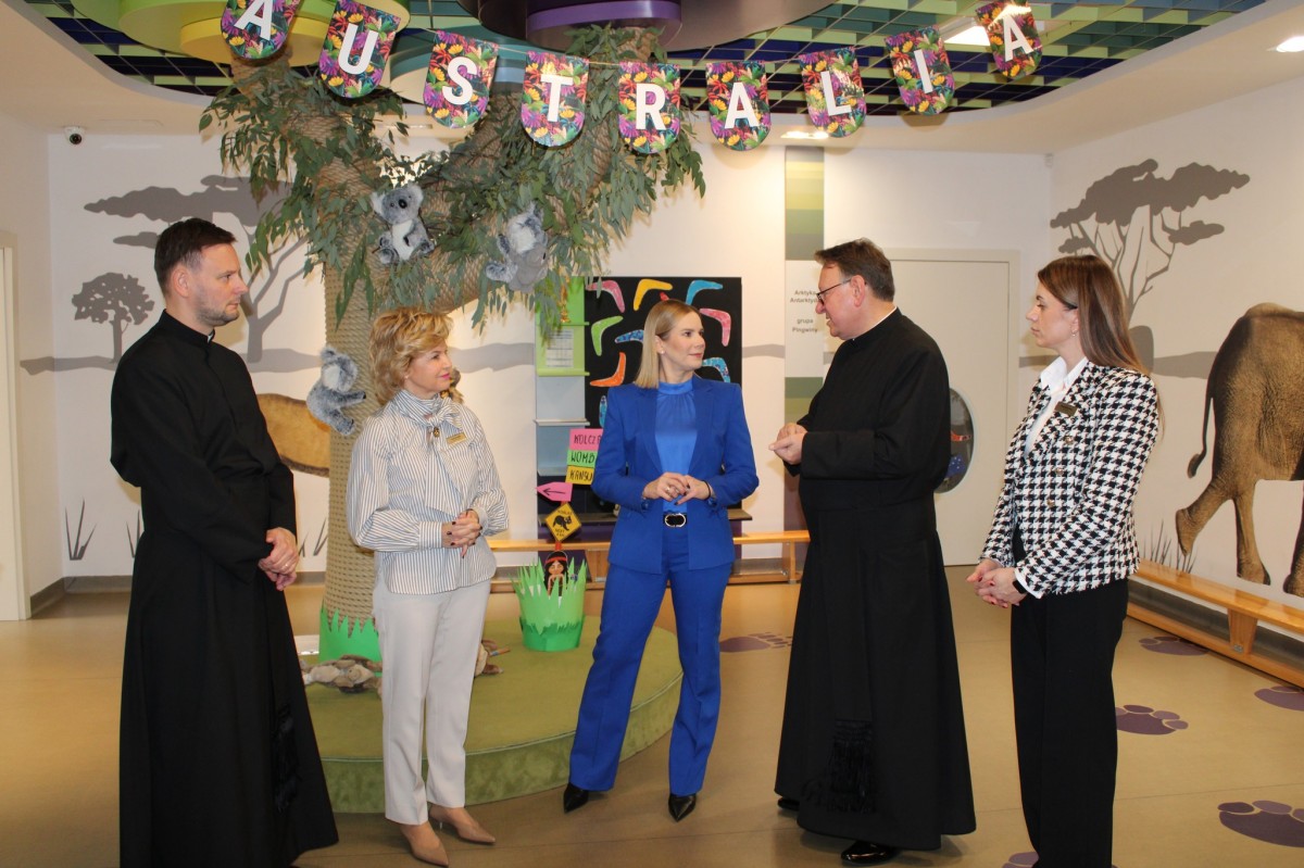 Na początku zobaczyła salę poświęconą Państwu Halinie i Kazimierzowi Wąsowskich, darczyńcom przedszkola, następnie kuchnię, a także spotkała się z jej personelem. Dyrektor Ewa opowiedziała historię pijarskiego przedszkola i pokazała galerię zdjęć z jego budowy.