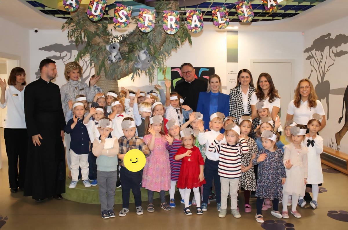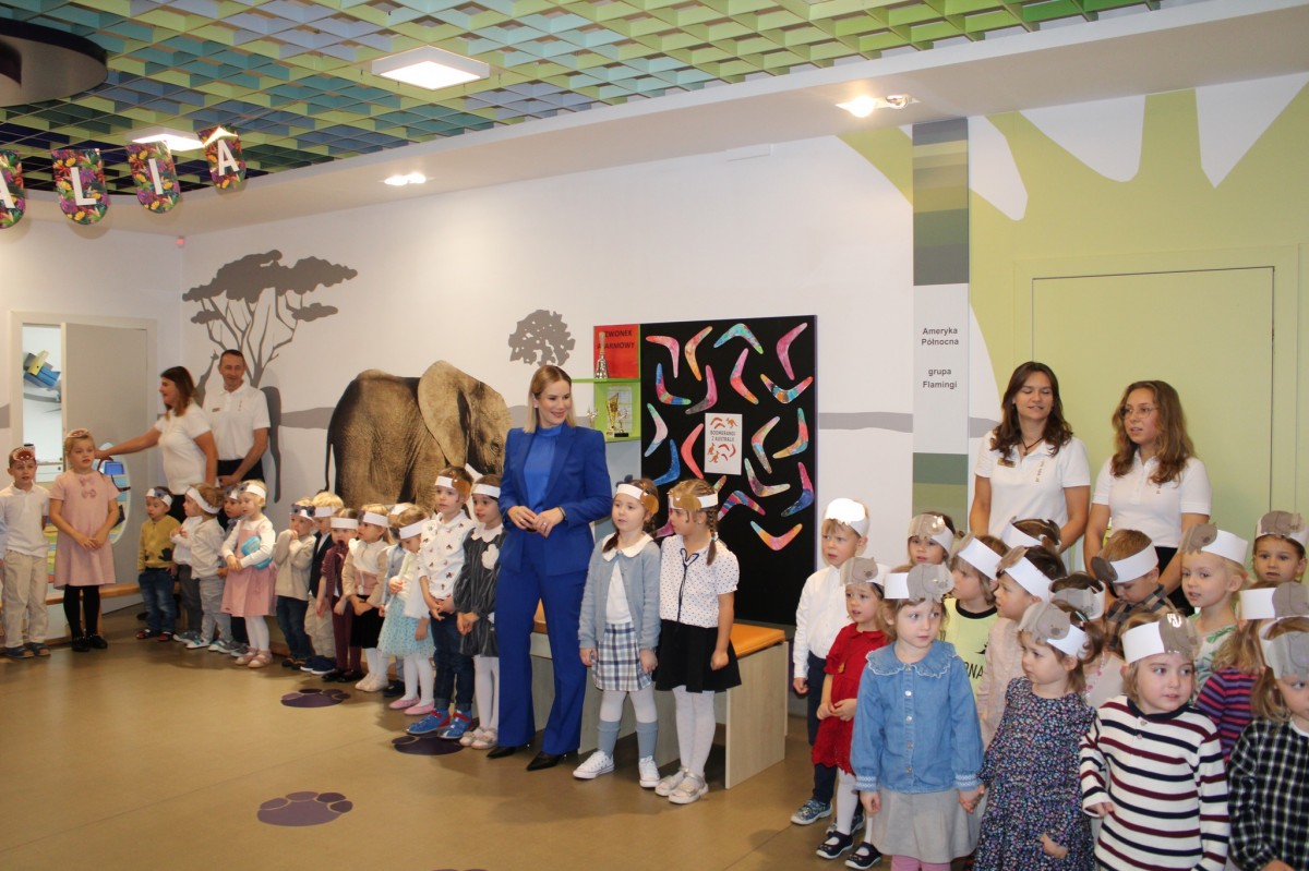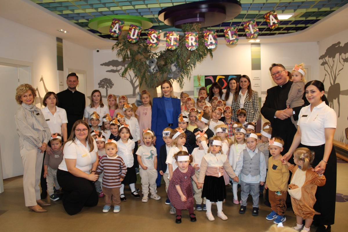 Dzieci z wychowawcami oraz pracownicy przedszkola były zebrane na holu pod Baobabem, gdzie Pani Dyrektor przywitała Małżonkę Prezydenta Polski, dzieci oraz pracowników przedszkola. Pani Wicedyrektor Agnieszka zaprosiła wszystkich do obejrzenia występu grupy Kangury. W ramach programu „Mały Europejczyk zwiedza świat” dzieci z opiekunkami przedstawiły Australię i zwierzątka tam żyjące oraz zaśpiewały i zatańczyły piosenkę o kangurkach.
