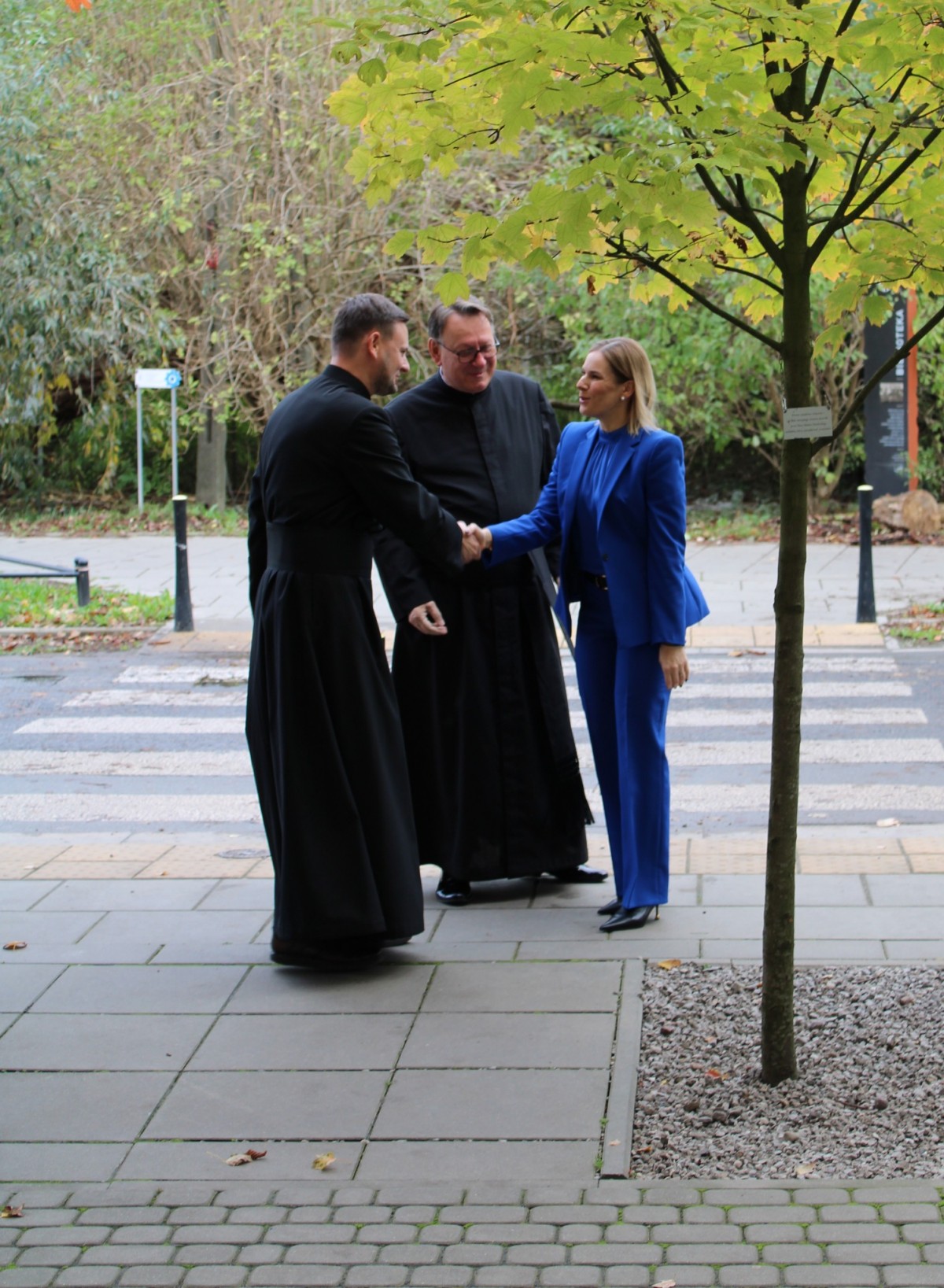 Po przywitaniu przez Dyrekcję Przedszkola Panią Ewę, Panią Agnieszkę, o. Bogdana Dufaja i o. Rafała Roszera, Rektora Kolegium Zakonu Pijarów Pierwsza Dama zwiedziła nasze przedszkole.