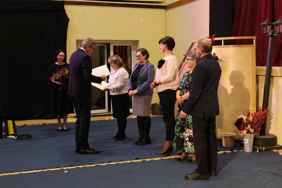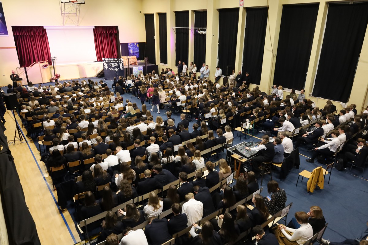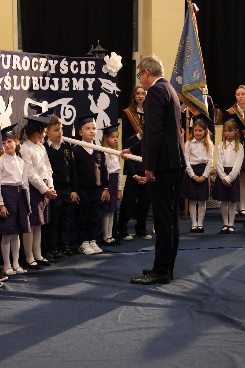 Po zakończonej Mszy Świętej wszyscy udali się na dalszą część obchodów, która była podzielona na dwie części. W pierwszej z nich zgromadzeni wzięli udział w ślubowaniu uczniów klas 1 szkoły podstawowej i liceum oraz występie pierwszoklasistów. Najmłodsi reprezentanci szkoły byli bardzo dobrze przygotowani, co zawdzięczali swoim wychowawcom – Agnieszce Dudzińskiej oraz Patrycji Jasce.