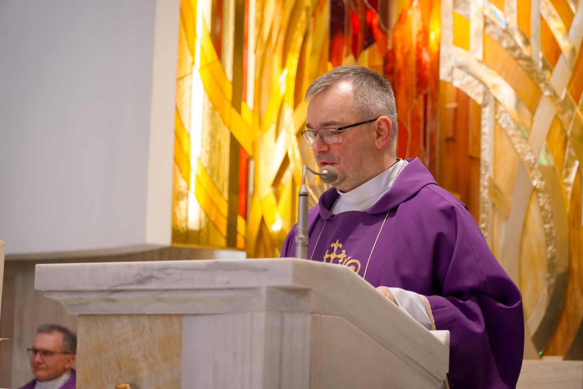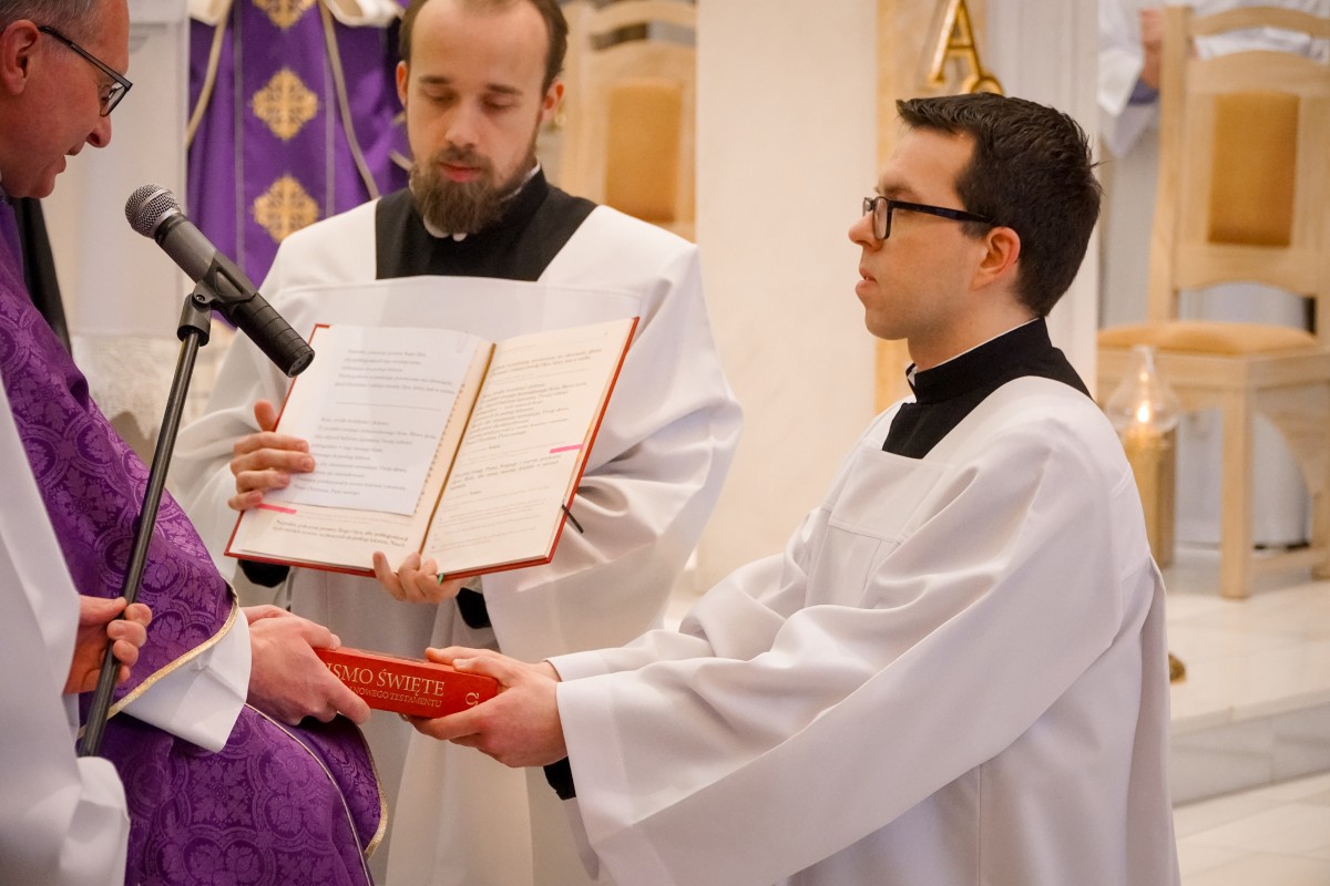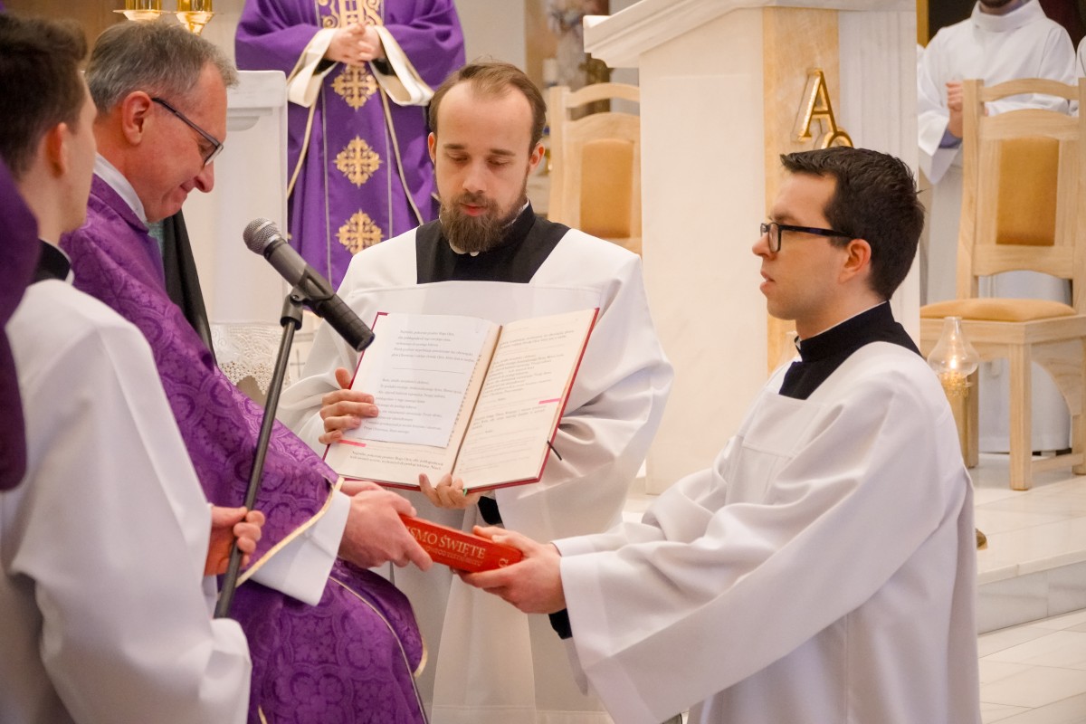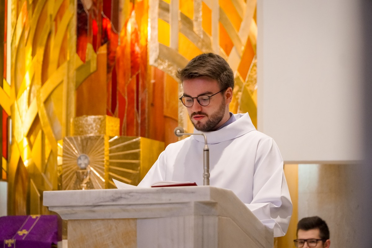 O. Prowincjał podczas kazania podkreślił, że Wielki Post to czas, by za św. Pawłem wziąć udział w trudach i przeciwnościach. Takie trudny dnia mamy na co dzień, by znosić je każdego dnia, a dodatkowo znosić je dla Ewangelii, by budować nasze relacje małżeńskie, rodzicielskie, pomiędzy pokoleniami. – Trzeba podjąć wysiłek, by wejść na górę Tabor – podjąć wyrzeczenia na czas Wielkiego Postu – postanowienia, zadośćuczynienia – mówił o. Mateusz. – Podczas spotkania z Mojżeszem i Eliaszem – o których usłyszeliśmy podczas Ewangelii – Jezus przygotowuje się, by zostać sam na krzyżu – weźmie udział w trudach i przeciwnościach, by służyć innym – dodaje o. Prowincjał. – Bóg nas wybawił i wezwał stosownie do naszego powołania. Tak jak dzisiaj wezwał kl. Dominika i kl. Jarosława. Z łaską Bożą otrzymują łaskę głoszenia Słowa Bożego, czytania, formowania, która dana jest w sakramentach.