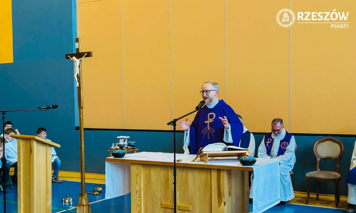 14 marca po południu wizytujący wzięli udział w Eucharystii w naszej parafii pw. św. Józefa Kalasancjusza w Rzeszowie, której przewodniczył o. Jacek Wolan. – Przypowieść o modlitwie faryzeusza i celnika w świątyni nie jest wycelowana w tych, którzy popełniają złe czyny, lecz w tych, którzy są przekonani, że robią wszystko dobrze – mówił podczas kazania o. Generał. – Ktoś może nawet wykonywać wiele praktyk religijnych, ale jednak bez Boga. Swoją religijność może traktować jak witrynę reklamową. Z Boga może uczynić niemego świadka swojej wyidealizowanej pobożności. Kościół, zamiast być miejscem budowania wspólnoty, staje się wtedy miejscem porównywania się z innymi. Cieszę się, że budujecie wspólnotę – wszyscy parafianie, a szczególnie młodzież – dodał Przełożony Zakonu. Po Mszy Świętej wizytujący spotkali się z młodzieżą pijarską, gdzie o. Carles i o. Jacek zostawili znak swojej obecności, odbijając swoje dłonie, dołączając do grona przyjaciół wspólnoty.