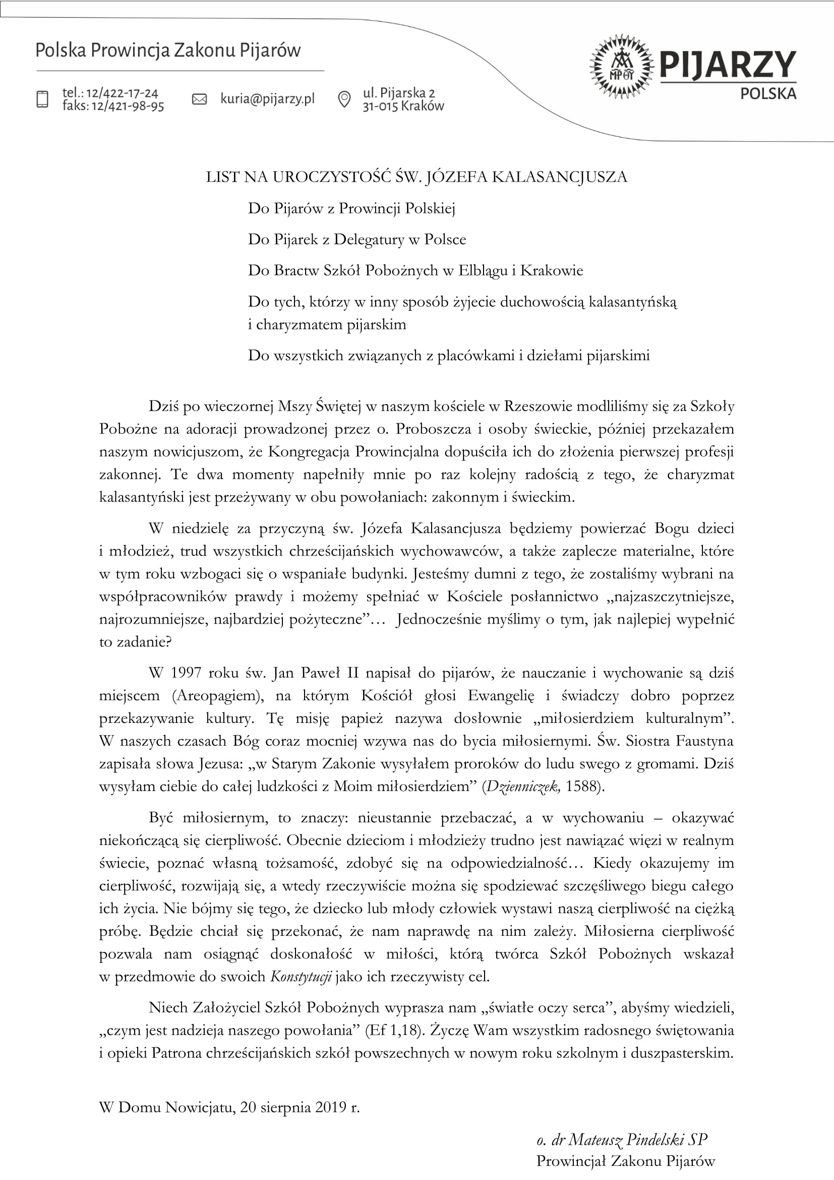25 sierpnia wszyscy, którzy żyją duchowością kalasantyńską i charyzmatem pijarskim przeżywają liturgiczną uroczystość św. Józefa Kalasancjuza, założyciela Zakonu Pijarów.