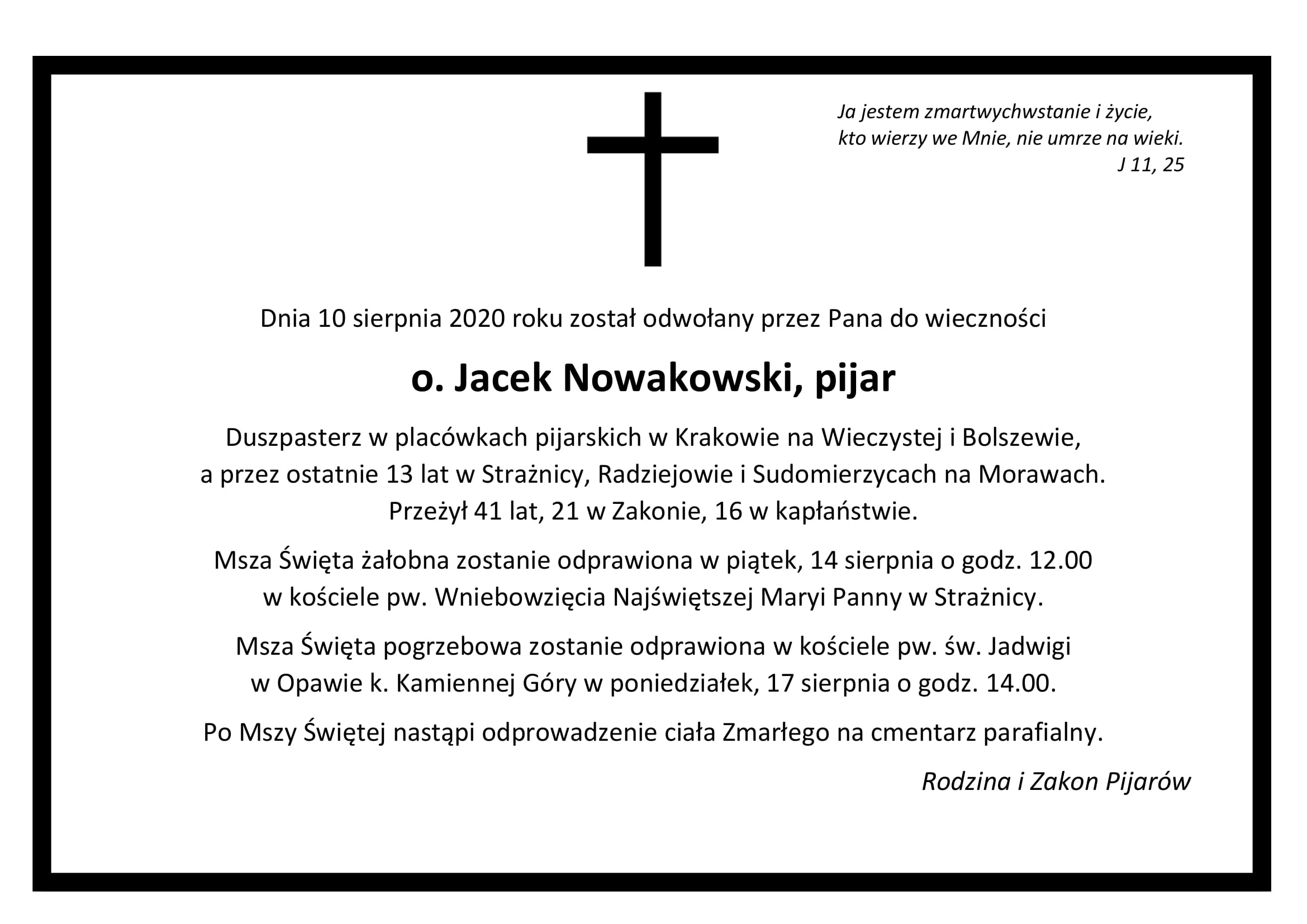 Dnia 10 sierpnia przed południem w wieku 41 lat zmarł o. Jacek Nowakowski, który od 13 lat mieszkał i pracował w Czechach. Msza Święta pogrzebowa zostanie odprawiona w kościele pw. św. Jadwigi w Opawie k. Kamiennej Góry w poniedziałek, 17 sierpnia o godz. 14.00.