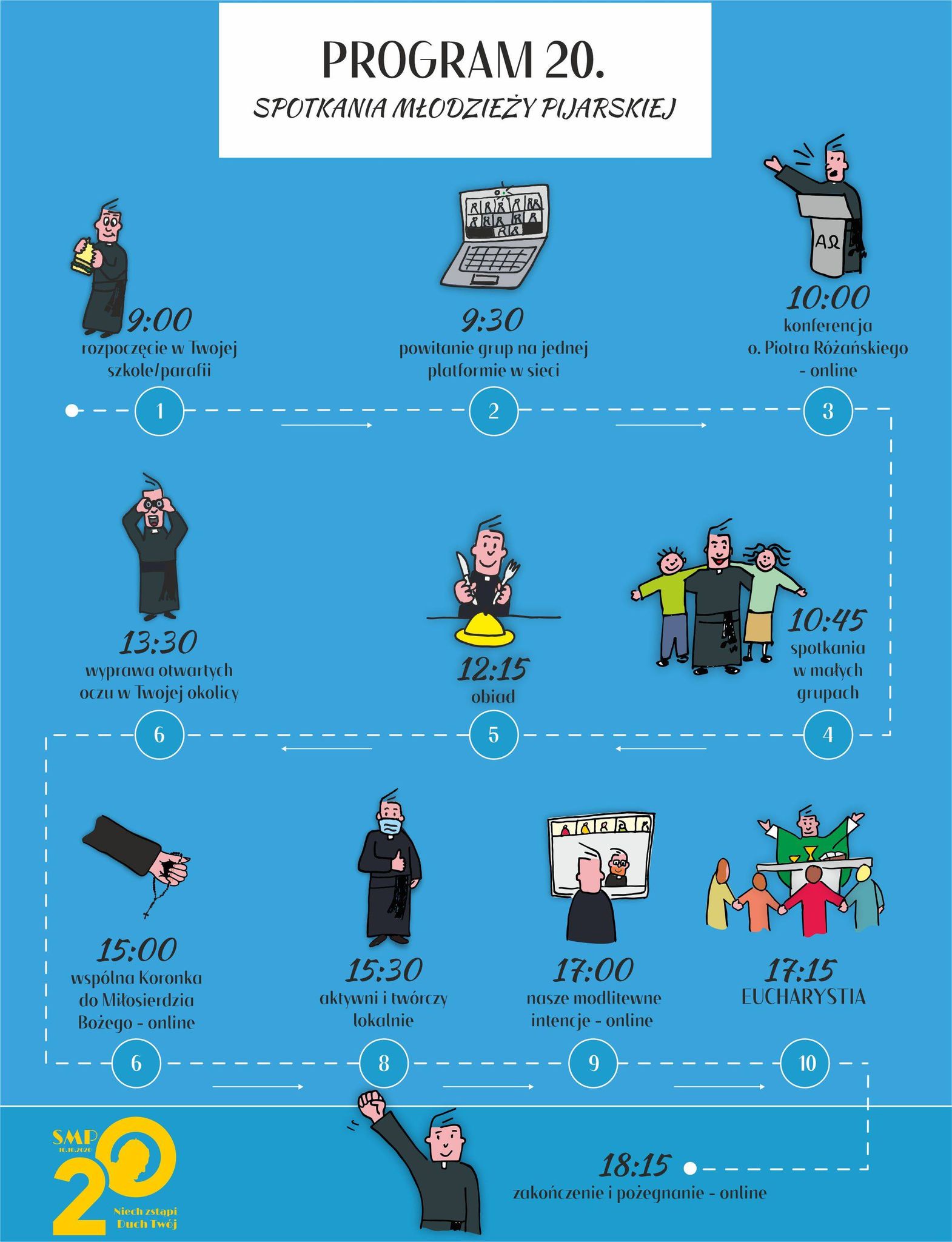W programie nie zabraknie stałych punktów jak wspólna Eucharystia, konferencja, czy spotkania w grupach. Za pomocą Internetu połączymy się z o. Piotrem Różańskim, który przekaże nam kilka cennych słów podczas konferencji. Na uczestników czeka również działanie w terenie.